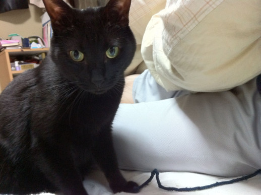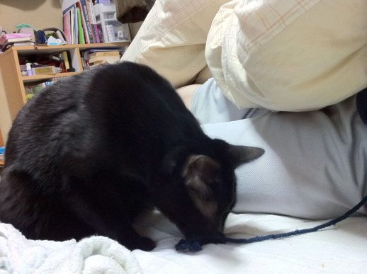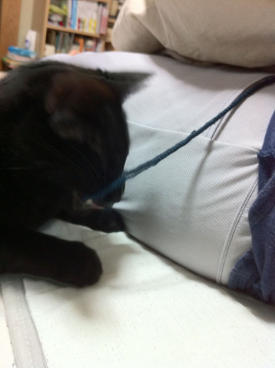 こたろう、ツマの部屋着である綿パンの腰紐がお気に入りです。