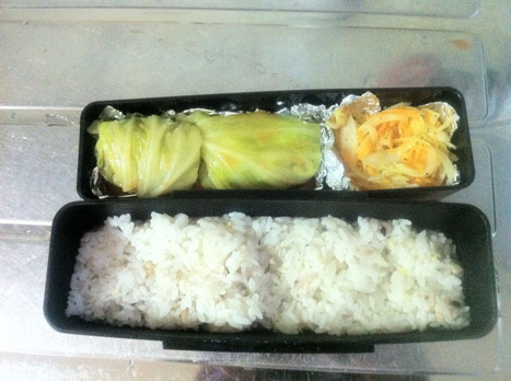 7.弁当箱にアルミホイルで器を作り、キャベツロールを並べて
