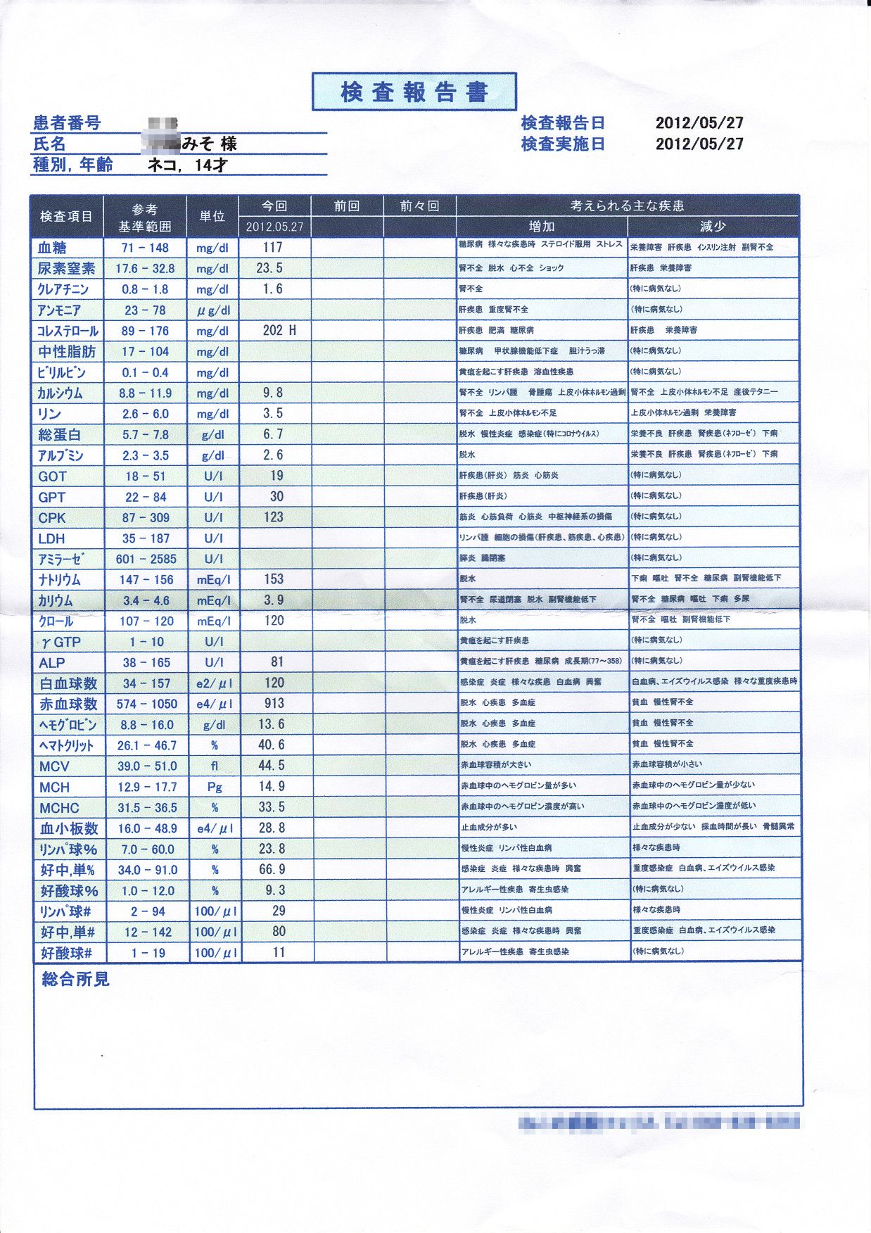 ポンちゃんもコレステロールがやや高いのと、ヘマトクリット値がやや低く